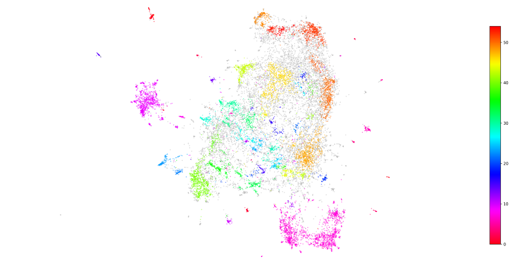 Great! We now have clustered similar documents together which should represent the topics that they consist of. To visualize the resulting clusters we can further reduce the dimensionality to 2 and visualize the outliers as grey points: