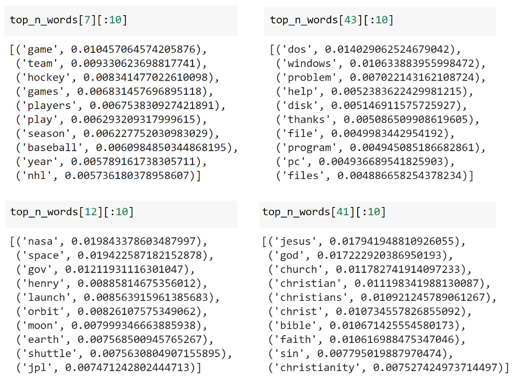 I can see sports, computers, space, and religion as clear topics that were extracted from the data.